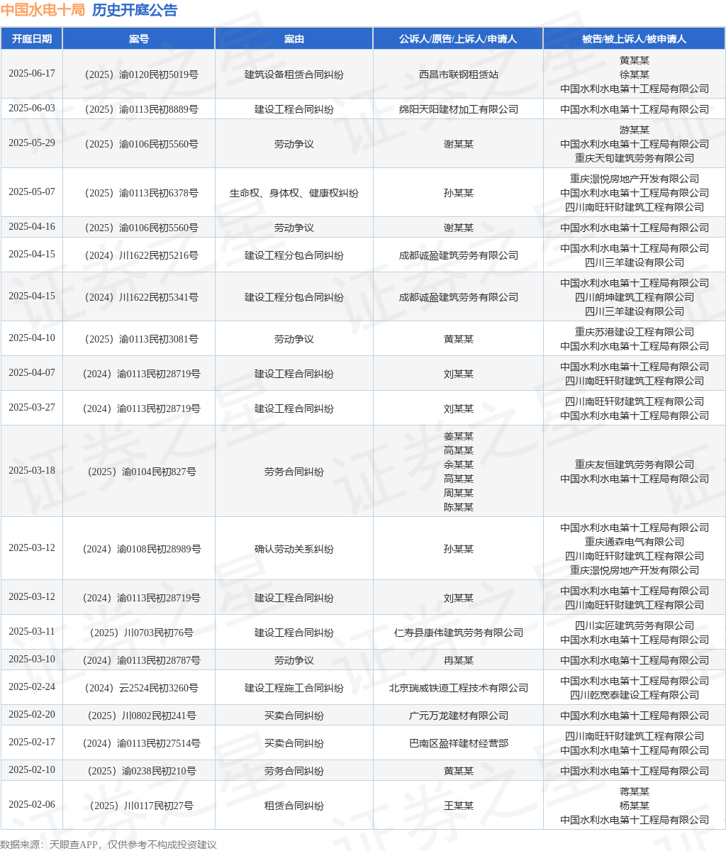 本站消息,根据天眼查APP显示,近日公布了一则中国水利水电第十工程局有限公司作为被告/被上诉人的开庭公告,详细内容如下: 案号:(2025)渝0120民初5019号审理法院:重庆市璧山区人民法院案由:建筑设备租赁合同纠纷当事人信息: 原告/上诉人:西昌市联钢租赁站 被告/被上诉人:黄某某、徐某某、中国水利水电第十工程局有限公司开庭日期:2025年6月17日根据统计,近一年内以中国水利水电第十工程局有限公司为当事人的历史开庭公告有86则,其中案由为“建设工程分包合同纠纷”的公告以16则居首,其次为“建设工程施工合同纠纷”有13则,“建设工程合同纠纷”有11则。历史开庭公告(前20条)如下: